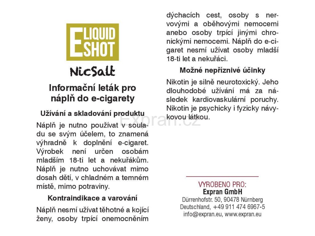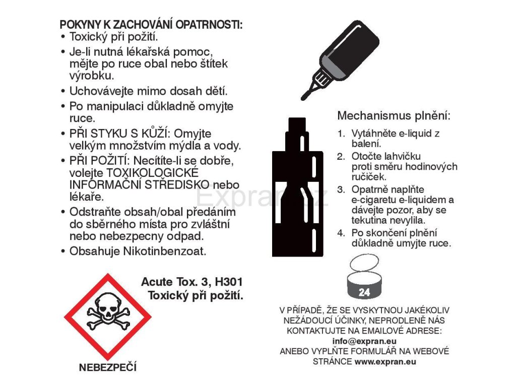 Uchovávejte mimo dosah dětí. Nepolykat !! Při požití, okamžitě vyhledejte lékaře. Ihned po kontaktu s e-liquidem si umyjte ruce. Nikotin se vstřebává i kůží.